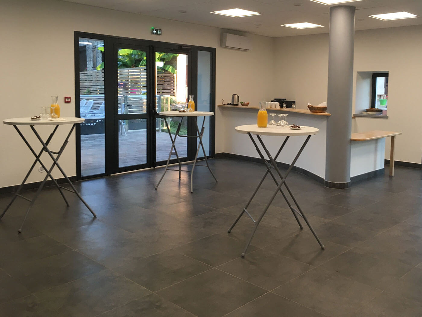 Accès direct au jardin, terrasses, PMR, comptoir bar, coin traiteur (frigo, bac à plonge, branchement camion)
